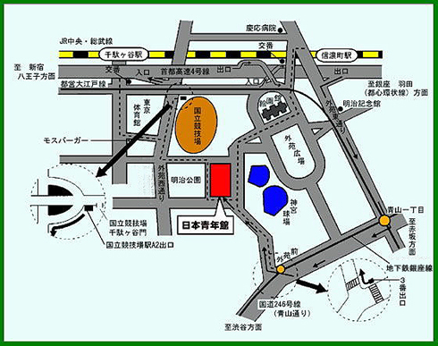 JR総武線千駄ヶ谷駅下車徒歩9分、信濃町駅下車徒歩9分 東京メトロ外苑前駅下車徒歩7分(3番出口) 都営大江戸線国立競技場下車徒歩7分(A-2出口)
