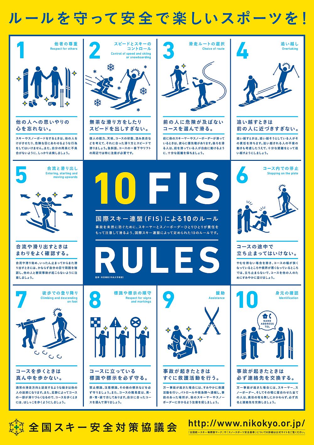 スキー、スノーボードに代表される雪上滑走用具の全ては、冬山の地勢を利用した高度の危険を内包したスポーツであり、スキーヤーは様々な気象条件のもとで斜面、雪質、コースの変化、混雑状況等に自己の技量、技術を対応させ、スピード、進行方向をコントロールしながら滑走し、自己および他のスキーヤーの安全に対して責任を自覚し、自己責任のもとに行われるスポーツでなければならない。